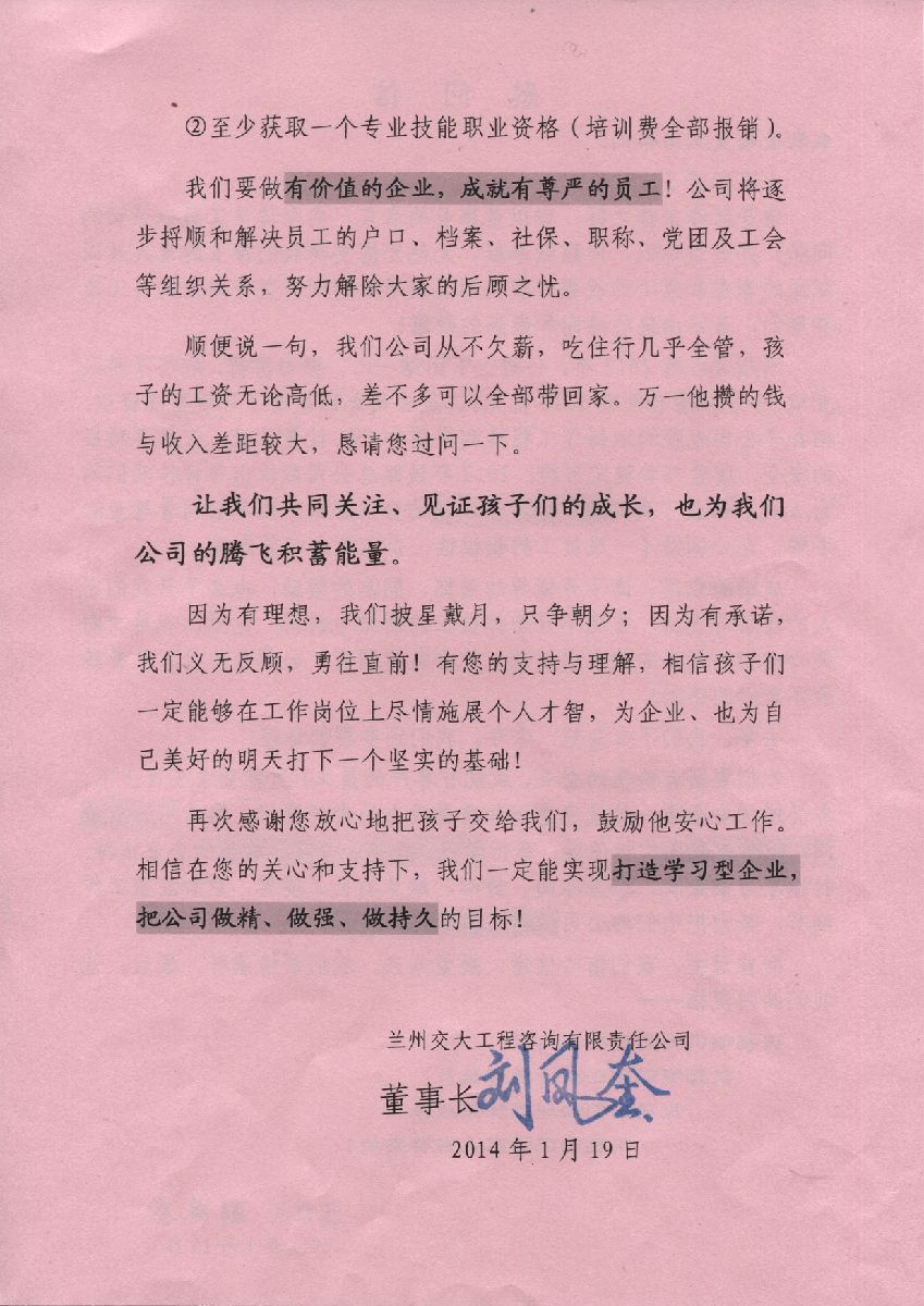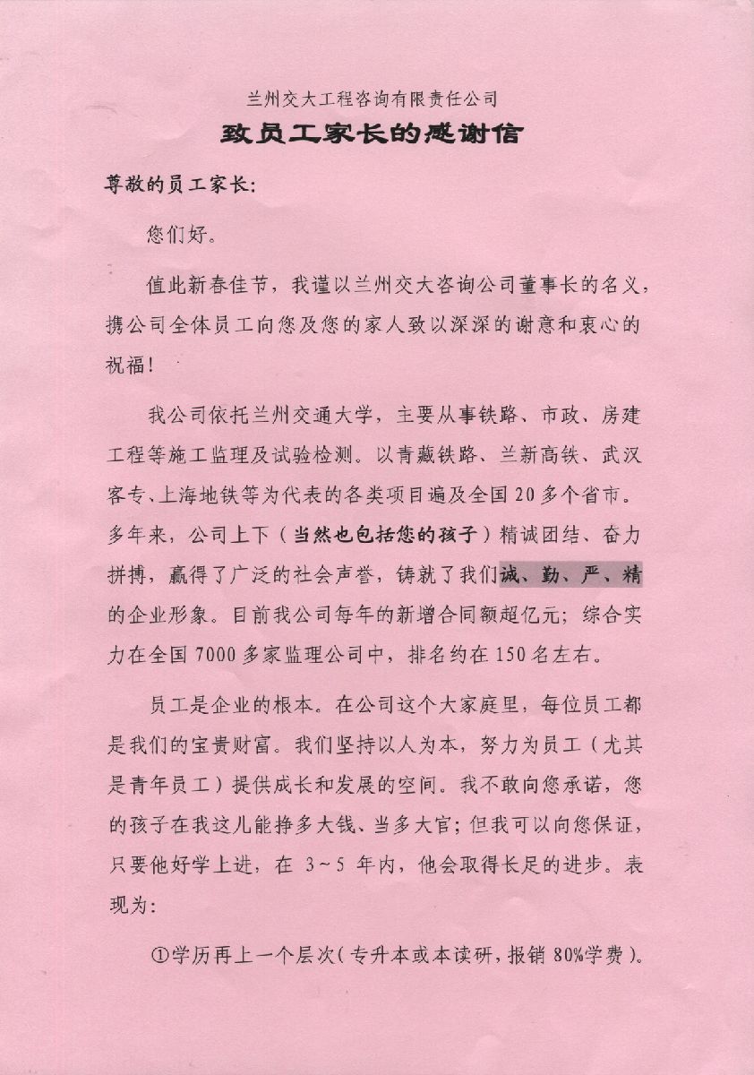 董事长致员工家长的感谢信