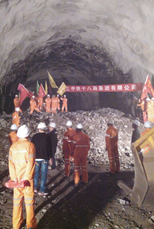 作为武九客专全线重难点工程的石马寨隧道,全长3685.36m,也是全线最长的隧道。最大埋深350m,地质结构复杂,贯穿12处岩溶发育异常地带,安全风险高,围岩变化大,极易发生突水、突泥现象,日最大涌水量为26640立方米。隧道施工排水采用深埋式中心管沟,在全国铁路富水岩溶喀斯特地貌隧道尚属首例,这也成为中国铁路总公司的科研立项课题之一。该隧道由进口横洞、1号斜井及出口组成,施工高峰期时共有五个作业面同时掘进。