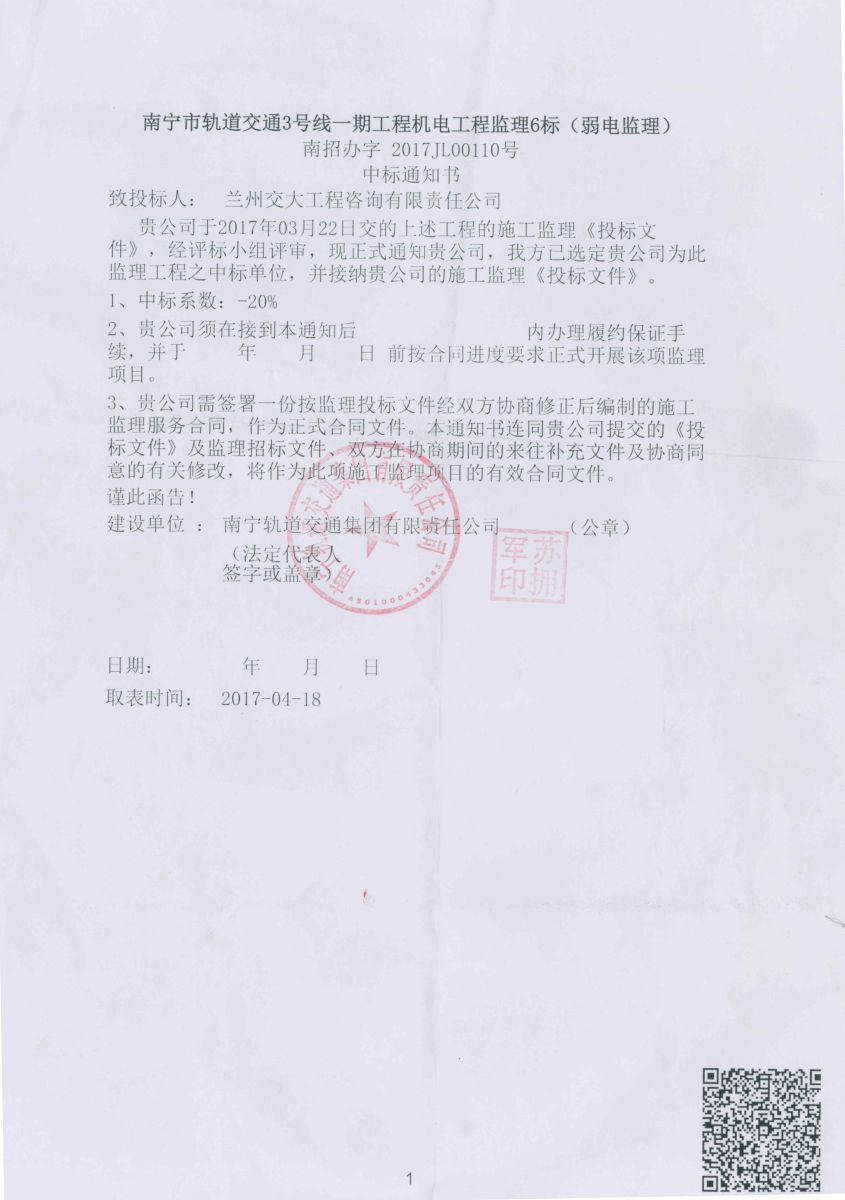 我公司于2017年4月18日成功中标南宁市轨道交通3号线一期工程机电工程监理6标项目。