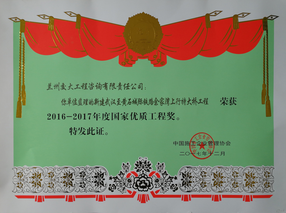 我公司监理的新建武汉至黄石城际铁路余家湾上行特大桥工程荣获2016-2017年度国家优质工程奖。