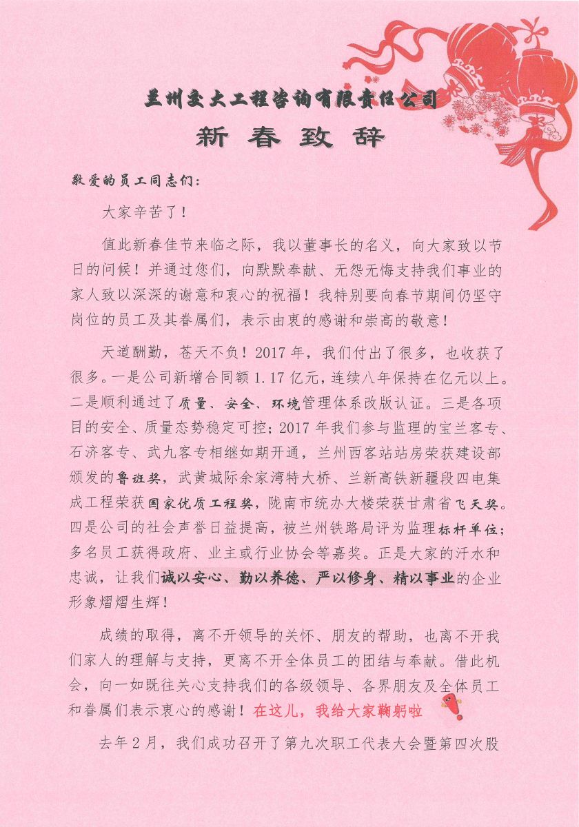 2018年董事长新春致辞
