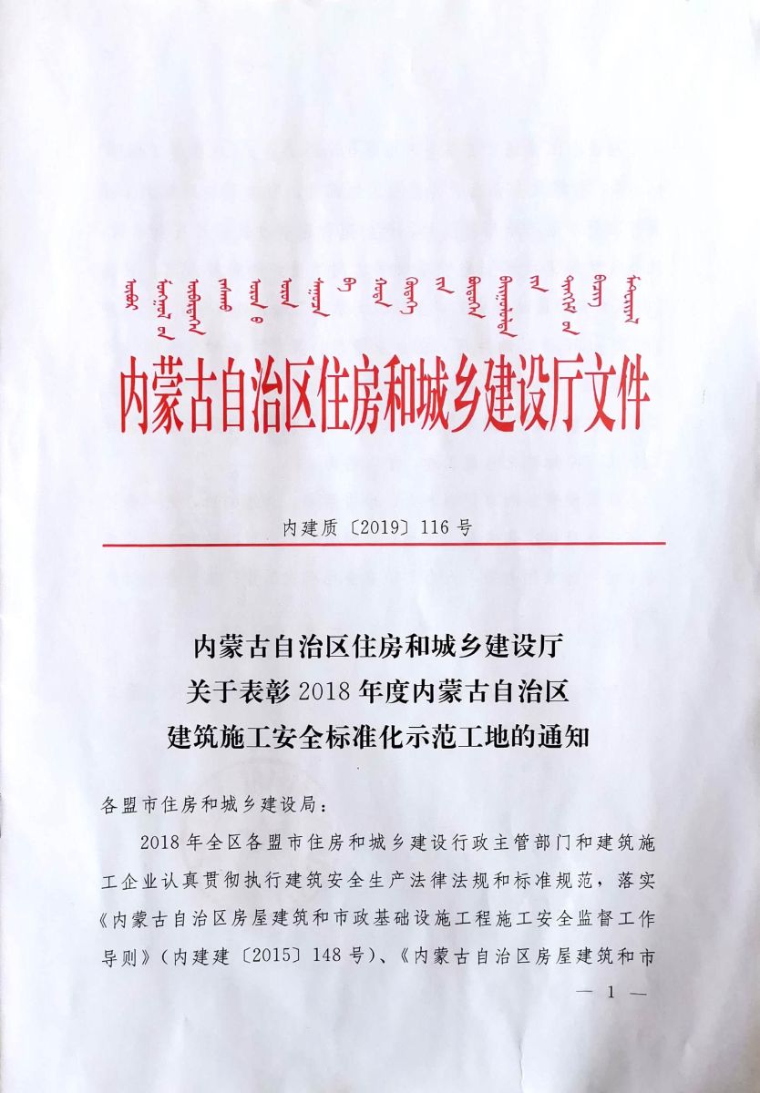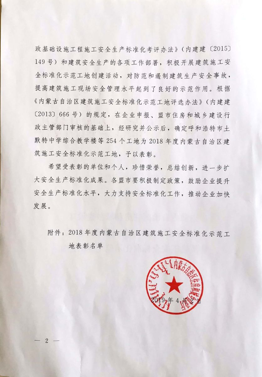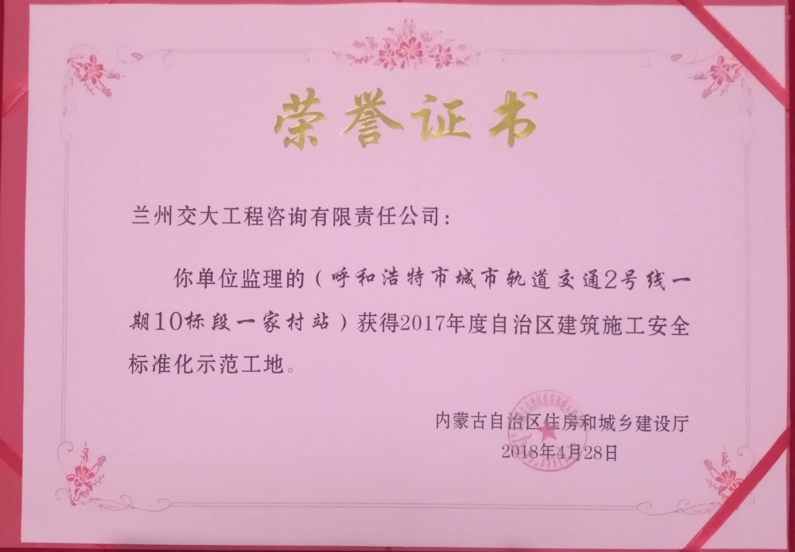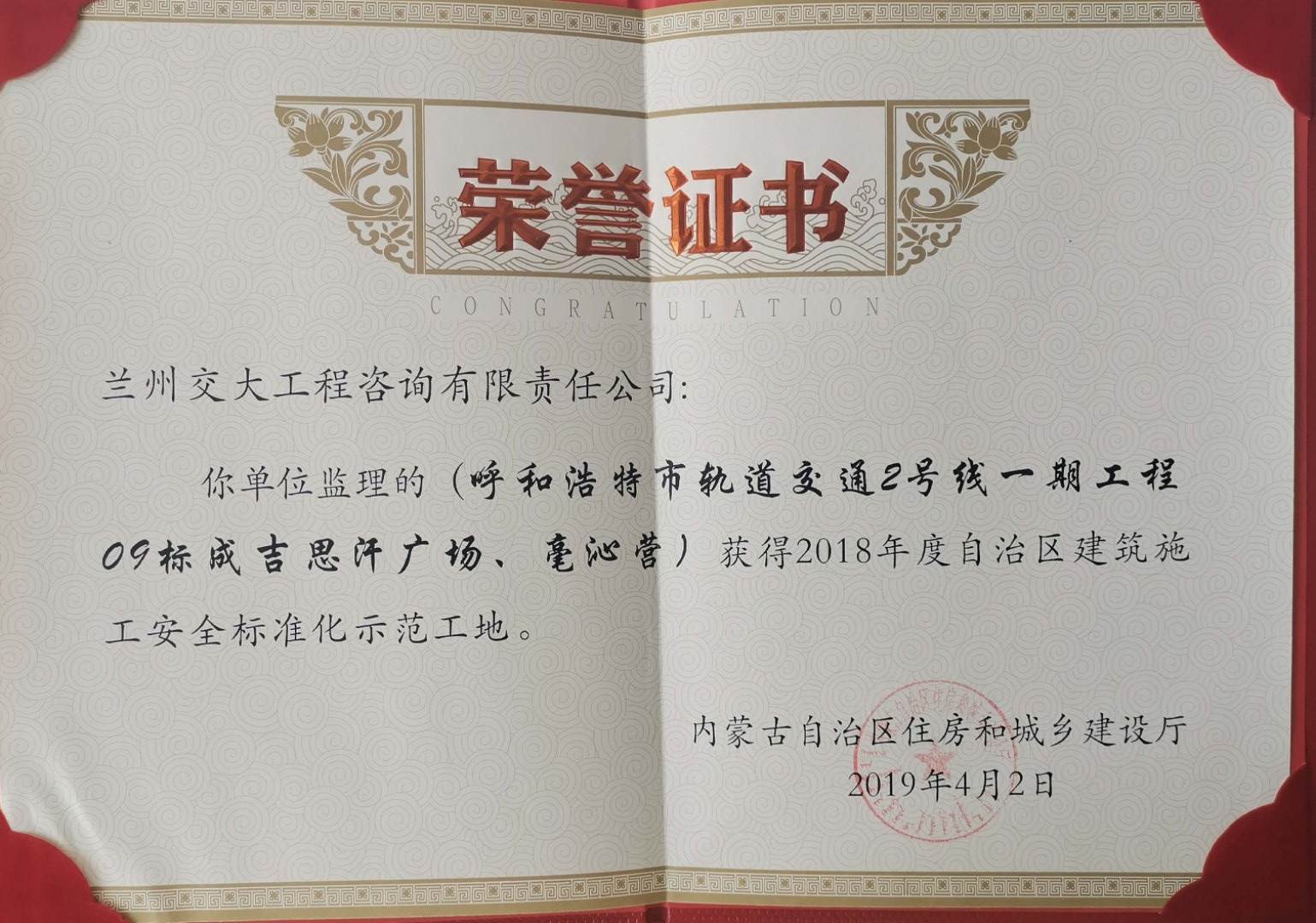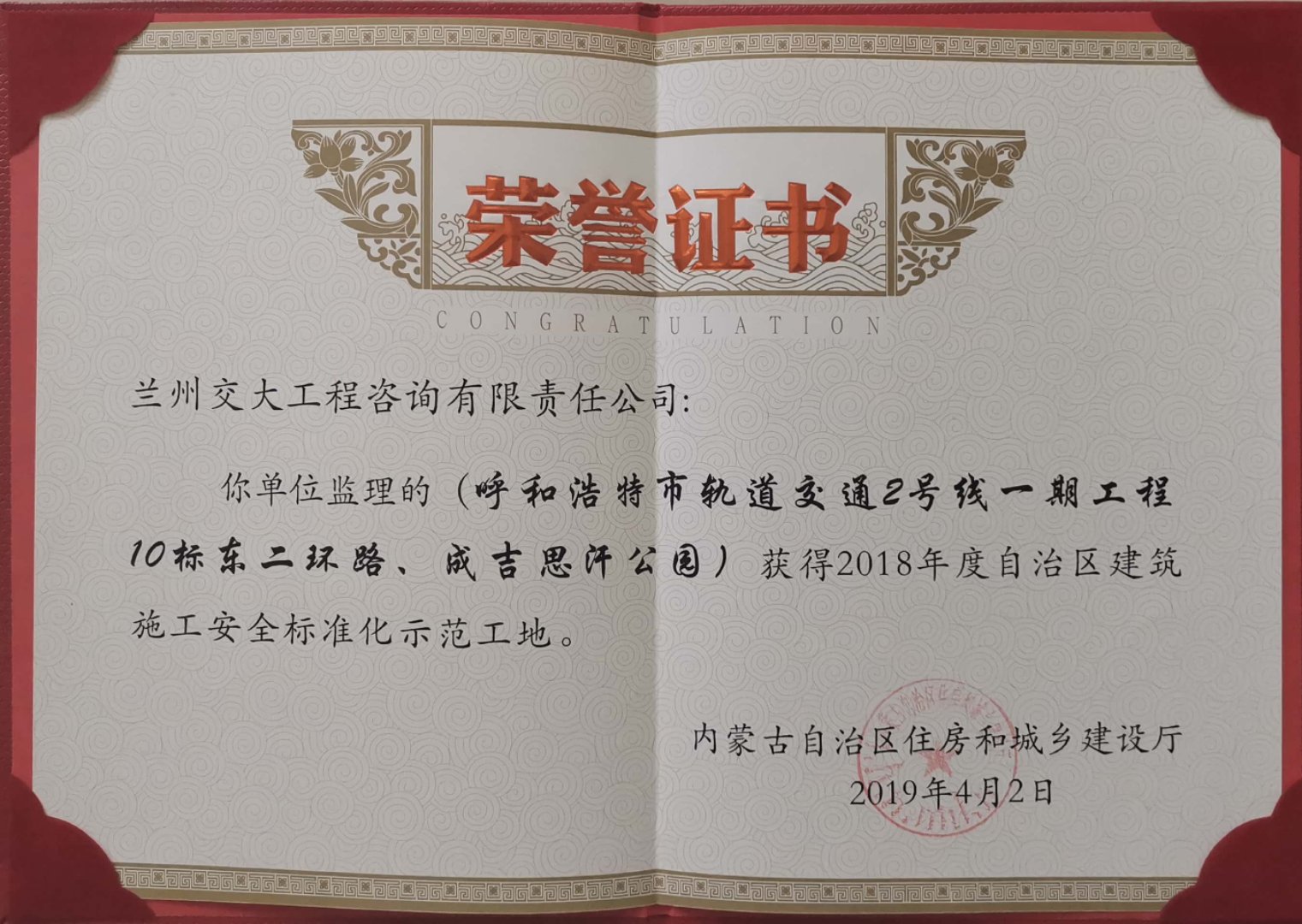 再传捷报!大同分公司呼市地铁2号线监理五标获得内蒙古自治区“2018年度建筑施工安全标准化示范工地”荣誉