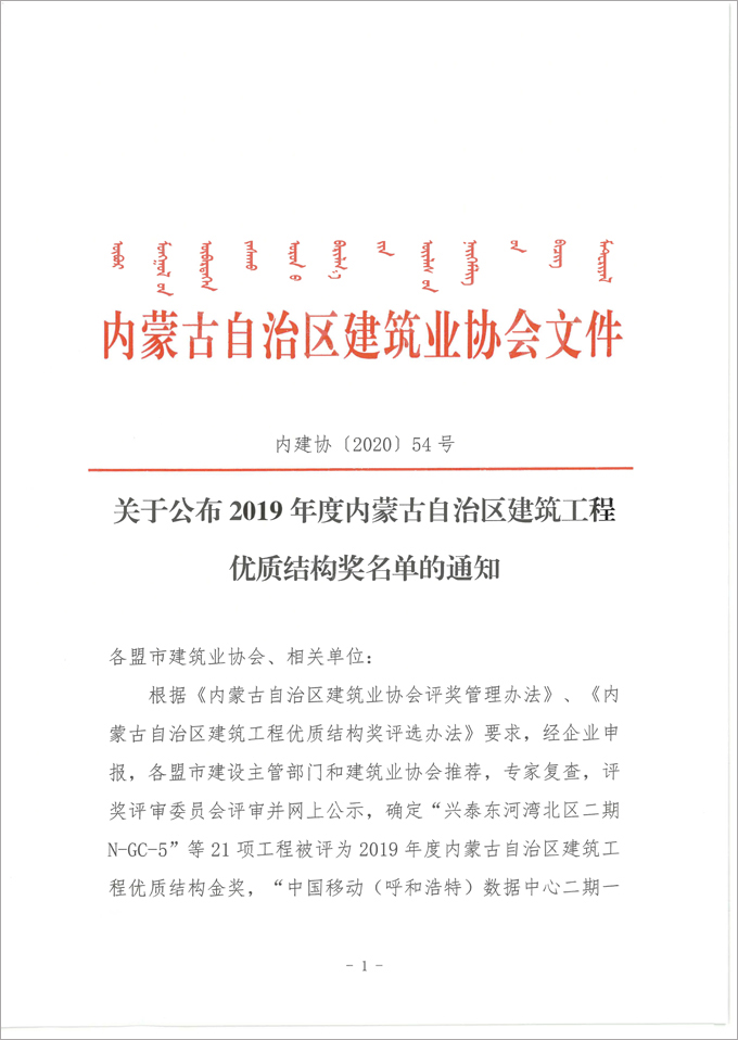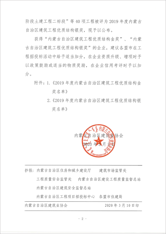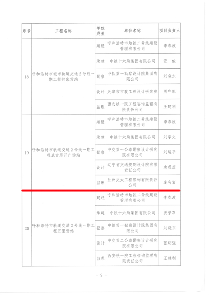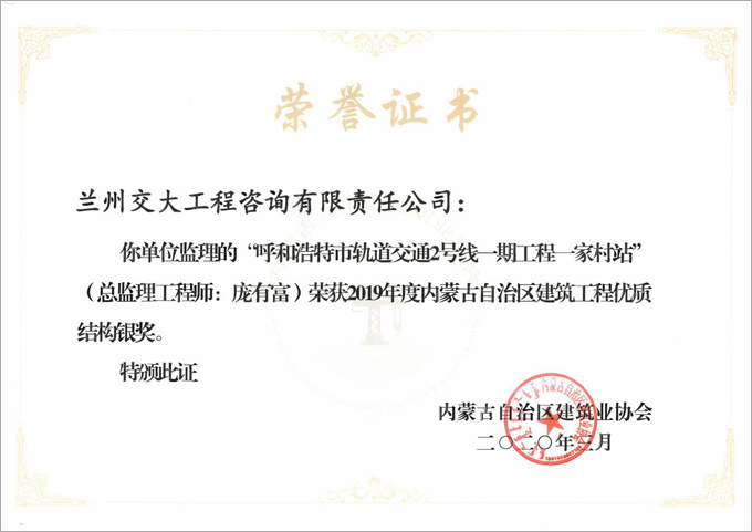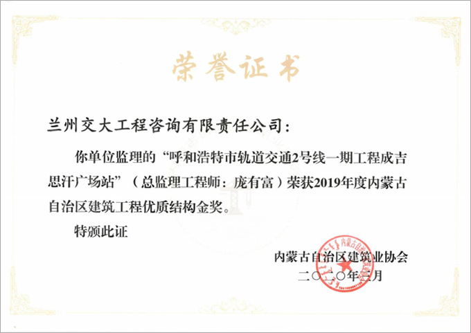 2019年度内蒙古自治区建筑工程优质结构奖评选结果揭晓,由我公司承担监理的呼和浩特市城市轨道交通2号线一期工程成吉思汗广场站、一家村站分别获得内蒙古自治区建筑工程优质结构金奖、银奖。