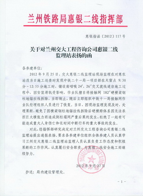 由于此次事故隐患发现及时,处理果断,避免了因横梁钢柱失去锚拉约束,可能导致硬横跨体系倒柱塌网,从而避免了一起可能造成重大人身伤亡和中断行车的事故。为此兰州铁路局惠银二线指挥部对我惠银二线监理站提出了表扬。