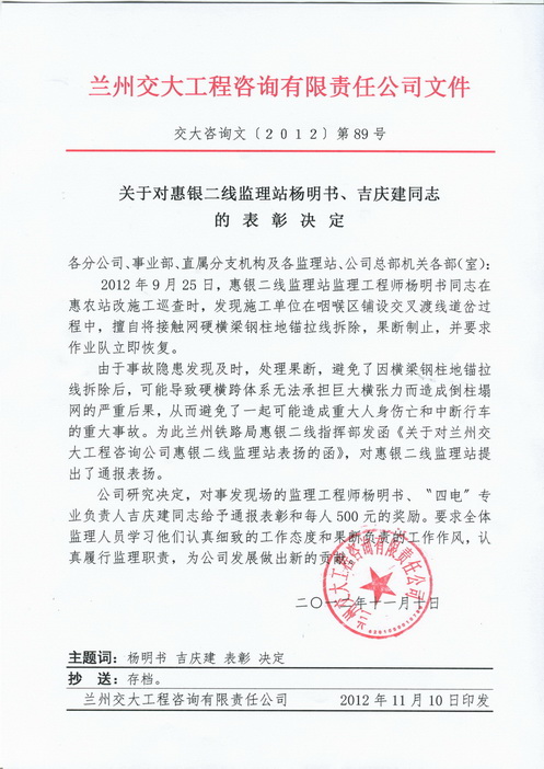 经公司研究决定,对事发现场的监理工程师杨明书、“四电”专业负责人吉庆建同志给予通报表彰和每人500元的奖励。同时要求公司全体监理人员学习他们认真细致的工作态度和果断负责的工作作风。